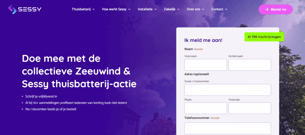 Energiecoöperatie Zeeuwind en het Sessy hebben hun krachten gebundeld voor een unieke collectieve inkoopactie voor thuisbatterijen. Inwoners van Zeeland kunnen profiteren van een collectieve korting die kan oplopen tot 20% op de Sessy thuisbatterij inclusief installatie. Op de Contacta beurs werd deze actie aangekondigd. Inmiddels staat de teller op bijna 200 inschrijvingen.