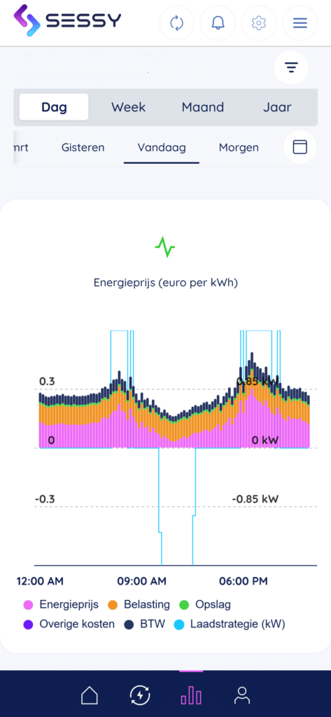Na installatie activeer je in de Sessy Portal de dynamische modus. Vanaf dat moment laadt en ontlaadt je batterij automatisch op basis van prijsverschillen.
