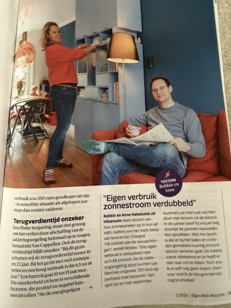 Deze week publiceerde Vereniging Eigen Huis de resultaten van het Energielab-onderzoek naar thuisbatterijen: een jaar lang praktijkdata van dertien huishoudens, gebaseerd op echt gebruik in echte woningen. Sessy is (was) trots om onderdeel te zijn van deze onafhankelijke pilot.