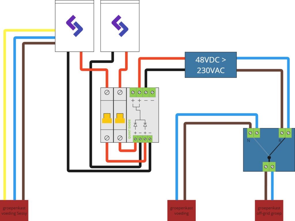 – Wil je meerdere Sessy’s koppelen aan de off-grid omvormer? Dan is het mogelijk om de uitgang van de 48V poort parallel te schakelen, dit kan echter niet zomaar. Omdat Sessy’s op verschillende batterij niveau’s zitten en er geen onderlinge communicatie is tussen de BMS’en is het niet veilig om 48V poorten aan elkaar te koppelen. Om de off-grid omvormer alsnog gebruik te laten maken van de capaciteit van alle paketten is het nodig om de stroomrichting enkel naar de omvormer toe te staan. Dit kan met een diode module. Nog leuker zou een ideale diode zijn om verliezen te voorkomen.