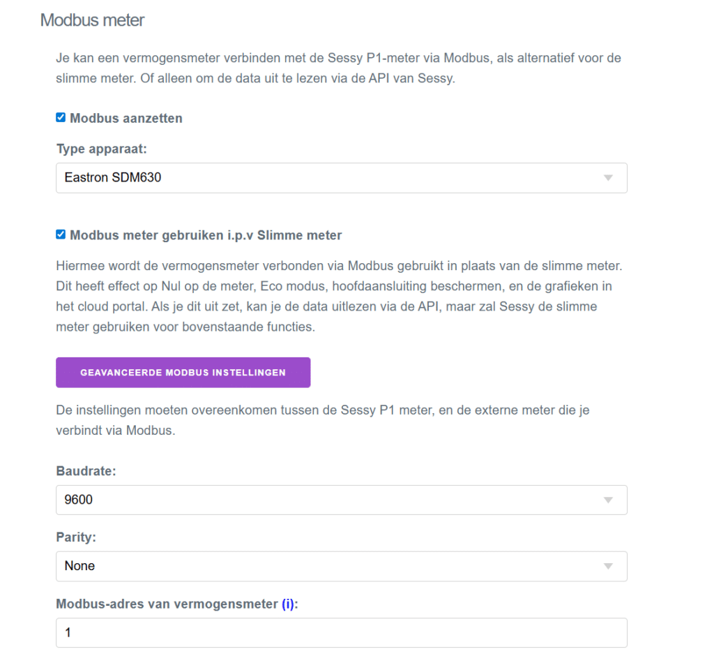De lokale instellingen pagina van de Sessy P1 meter heeft onderstaande modbus instellingen